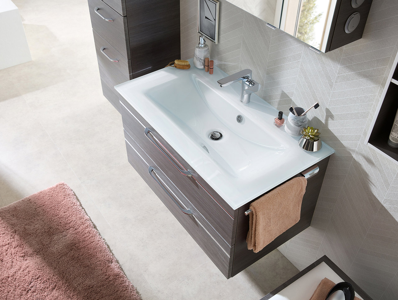 Die stylischen Fronten der Waschtischunterschränke im Glasdesign oder mit gesofteten Kanten und einer hochwertigen Chrom-Applikation machen Ihr Bad zum coolen Highlight. Stimmungsvoll elegante Beleuchtungen und Lichteffekte in den Möbeln und den edlen Mineralmarmorwaschtischen setzen ihr Umfeld stilvoll in Szene. Die sorgsam ausgewählten Farb- und Dekor-Welten verzaubern ihren Betrachter, wecken Leidenschaft und das Verlangen nach mehr. Ein Badmöbelprogramm, das mit großer Designvielfalt überzeugt und Ihr Bad in einem ganz besonderen Glanz erstrahlen lässt.
